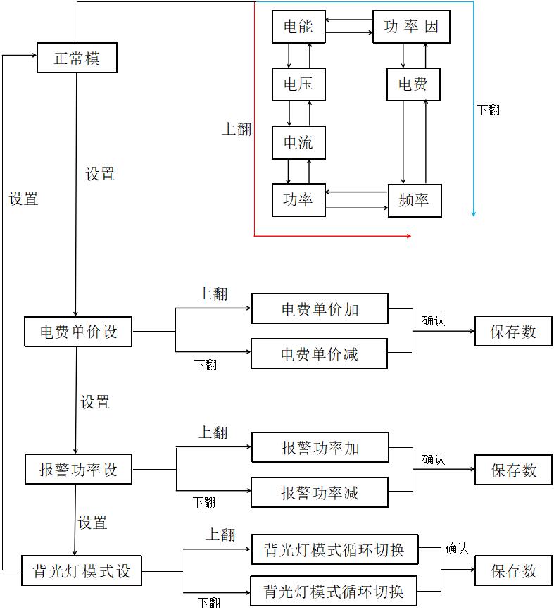 3、“下翻”鍵,在正常模式先用于循環切換顯示界面,在設置電費單價模式下用于電費單價“-”,在設置報警功率模式下用于報警功率門限“-”。